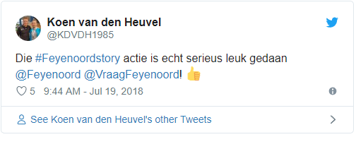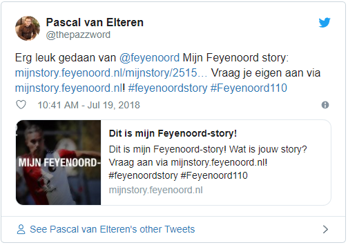 Alle supporters die bij Feyenoord bekend zijn met hun geboortedatum en hebben aangegeven dat ze e-mails willen ontvangen van Feyenoord ontvingen hun persoonlijke story op 19 juli per e-mail. Wanneer je niet tot deze groep behoorde kon je je Feyenoord-story aanvragen via https://mijnstory.feyenoord.nl. De campagne liep t/m donderdag 2 augustus 2018, dat was de laatste dag dat de persoonlijke Feyenoord-story aangevraagd kon worden.