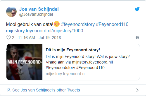 Ruim 450.000 Feyenoord-supporters ontvingen op 19 juli 2018, de jubileumdag, een unieke infographic met daarin hun persoonlijke ‘Feyenoord-story’ vol feitjes en cijfers, berekend vanaf iemands geboorte.